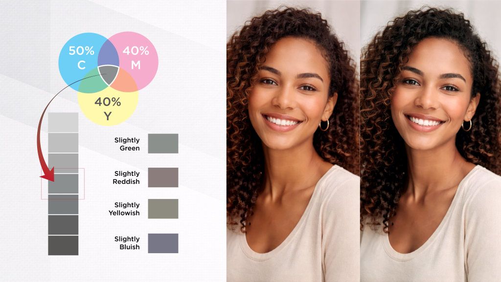 To the human eye, grey shifts are extremely noticeable. Humans are highly sensitive to neutrality — even a tiny colour cast reads as “something is wrong.”